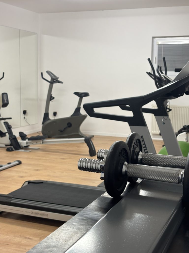 V posilovně najdete: bench press, posilovací věž, boxovací pytel, bradla s popruhy, kardio stroje – běžecký pás, veslařská lavice, rotoped, crosstrainer, stepper.